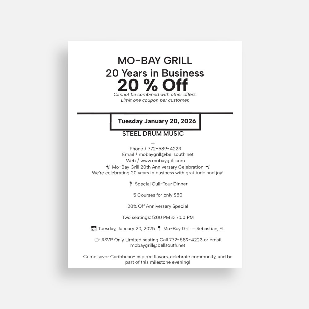 Mo Bay Grill is a Jamaican seafood restaurant that provides those in Sebastian, FL and the surrounding area with the waterfront dining experience they desire. We're located at a unique view of the Indian River Lagoon. With an extensive selection of dishes that includes favorites like crab, lobster, and steak, we are sure that we will have something that everybody will love. Owned and operated by a renowned owner and competition chef, Wesley Campbell, we are a family restaurant that is constantly striving to ensure that each and every customer is treated like a part of the Mo Bay Grill family.